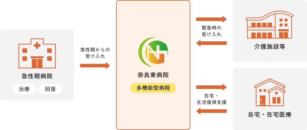 奈良東病院は急性期から慢性期までをつなぐ多機能型病院として、